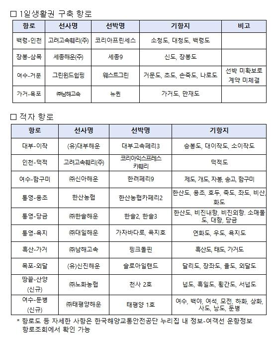 해양수산부는 연안여객선의 항로 단절을 막고 섬 주민의 1일 내 육지 왕복을 실현하기 위해 2018년부터 운항결손금의 일부를 지원하는 ‘연안여객항로 안정화 지원사업을’ 추진해 오고 있다. 올해는 상반기에 적자항로* 8곳과 1일 생활권 구축 항로 4곳을 선정했으며, 하반기에는 지난 8월 25일부터 9월 5일까지 신청을 받은 후 학계·연구기관·현장전문가 등으로 구성된 항로선정위원회의 심사를 거쳐 2개 지원항로를 추가로 선정했다.