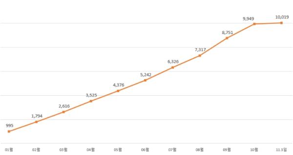 농림축산식품부는 2025년 11월 3일 기준 농수산물 온라인도매시장 연간 거래금액이 1조 원을 돌파했다고 밝혔다. 이는 전년동기 대비(3,392억원) 약 2.9배 높은 금액으로, 현재 일평균 거래 금액 유지 시 연말까지 약 1조 1,700억 원의 거래 실적을 달성할 것으로 예상된다.