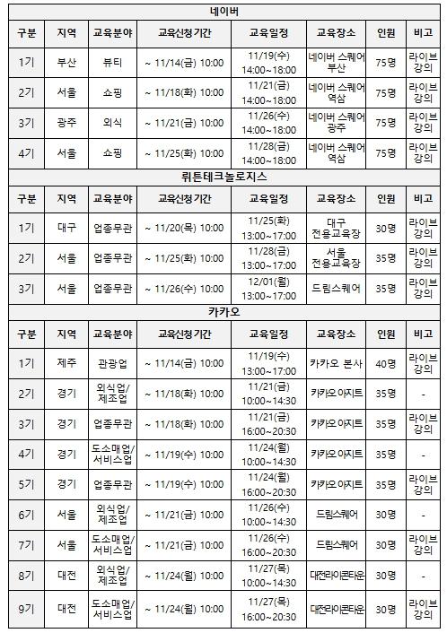 국내의 대표적인 인공지능(AI) 기업인 네이버, 뤼튼테크놀로지스, 카카오(이상 가나다 순)가 교육기관으로 참여하며, 각 기관이 직접 기획한 교육과정(커리큘럼)에 따라 현장 교육과 온라인 교육이 함께 진행될 예정이다.