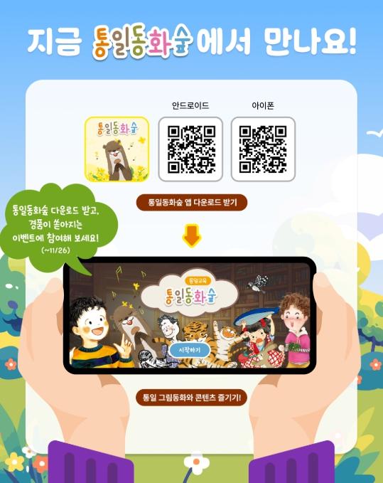 '통일동화숲' 응용프로그램(앱)은 ‘구글 플레이스토어’나 ‘애플 앱스토어’에서 무료로 내려받을 수 있으며, 11월 12일부터 26일까지 응용프로그램(앱) 내려받기 행사도 진행된다. 행사는 응용프로그램(앱)을 설치 또는 갱신한 뒤 주요 화면에 뜨는 새로운 창을 통해 참여할 수 있다.