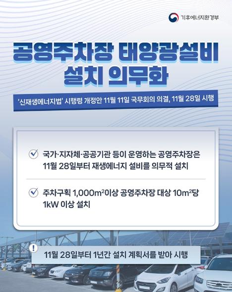 - 국가·지자체·공공기관 등이 운영하는 공영주차장은 11월 28일부터 재생에너지 설비를 의무적 설치