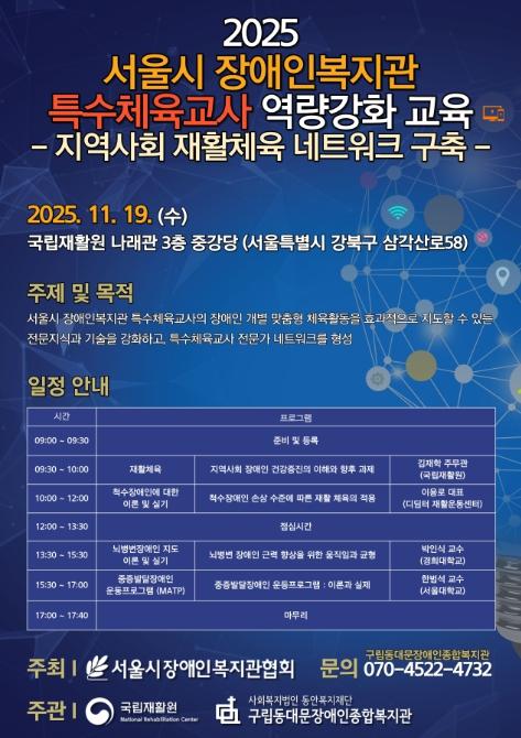 강윤규 국립재활원장은 “특수체육교사는 지역 장애인의 건강 증진을 이끄는 핵심 인력이며, 국립재활원은 앞으로도 현장 중심의 역량 강화를 위해 지역사회와 협력해 지속 가능한 재활체육 모델을 확산하겠다”라고 밝혔다.
