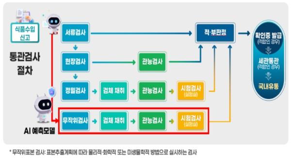 ‘인공지능(AI) 기반 수입식품 위험예측 검사시스템’은 축적된 과거 부적합 내용, 원재료 등 수입식품 검사 정보와 해외 환경·위해정보를 융합한 빅데이터를 인공지능(AI)이 학습하여 부적합 가능성(위험도)이 높은 수입식품을 통관 단계에서 무작위검사 대상으로 자동 선별하는 모델이다.