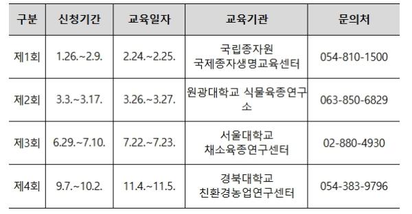 교육운영 방식은 전년도 교육 수료자들의 의견을 반영하여 집합(24일)과 온라인교육(25일)을 병행하여 운영되며 교육 신청자는 관련 세부 사항 및 일정(교육신청: 1.26~2.9)을 국제종자생명교육센터 누리집에서 확인할 수 있다.