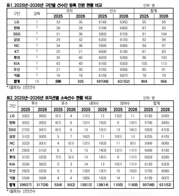 KBO는 2월 10일(화) 2026년 KBO 리그 소속 선수 명단을 공시했다. 10개 구단은 총 621명의 선수를 등록해, 597명이 등록했던 2025년보다 24명이 늘어났다.