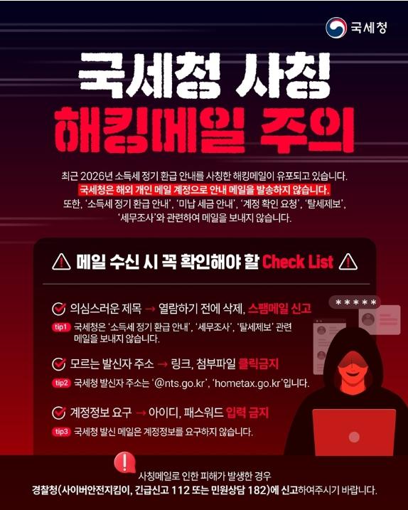 최근 2026년 소득세 정기 환급 안내를 사칭한 해킹메일이 유포되고 있습니다. 국세청은 해외 개인 메일 계정으로 안내 메일을 발송하지 않습니다. 또한, '소득세 정기 환급 안내', '미납 세금 안내', '계정 확인 요청', '탈세제보', '세무조사'와 관련하여 메일을 보내지 않습니다.