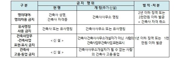 하지만 건축사사무소의 명의를 대여·차용하거나 건축사사무소 또는 이와 비슷한 명칭을 사용하는 행위, 비(非) 자격자의 건축사업무 또는 건축사업 표현·표시 및 건축사 고용·동업 행위 등에 대해서는 처벌 규정이 없어 건축 시장질서 혼란과 국민 피해가 지속되어 왔다.