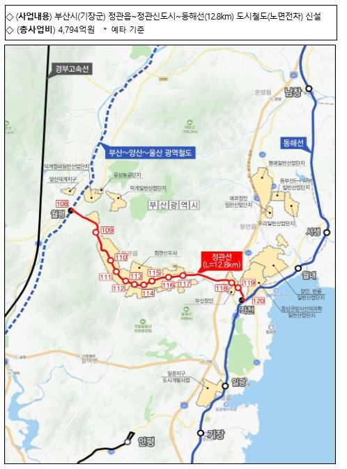 정관선 건설사업은 기장군 정관읍 월평리를 시점으로 정관신도시를 거쳐 동해선 좌천역까지 12.8㎞구간(정거장 13개소)을 연결하는 도시철도(노면전차) 사업으로, '17년 부산광역시 도시철도망 구축계획('16~'25)에 반영된 이후, '22년 5월 사전타당성조사를 거쳐 '23년 8월 예타에 착수(KDI)했으며, 경제성 분석(B/C), 정책성 분석 등에 대한 종합평가('26.1.15.)를 거쳐 금일 예타를 통과하게 됐다.